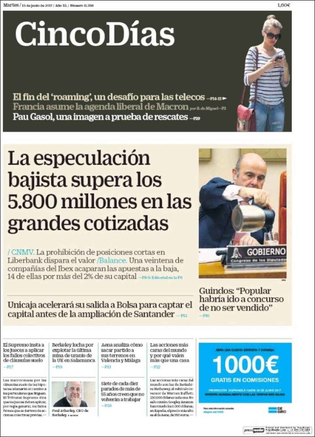 CINCO DÍAS: "La especulación bajista supera los 5.800 millones en las grandes cotizadas"; "Unicaja acelerará su salida a Bolsa para captar el capital antes de la ampliación de Santander"; "Guindos: 'Popular habría ido a concurso de no ser vendido'".
