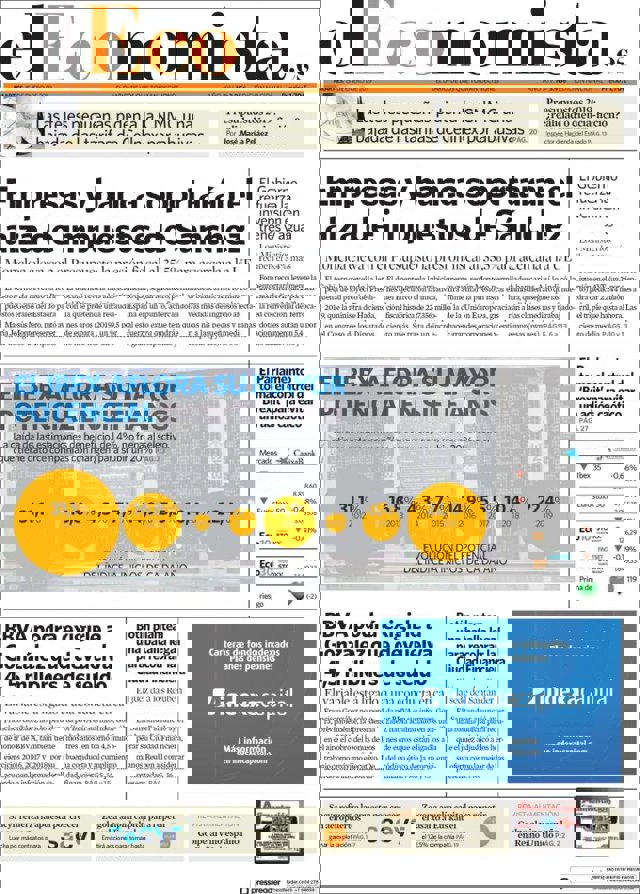 EL ECONOMISTA: "Empresas y banca soportarán el alza de impuestos de Sánchez"; "El Gobierno refuerza la inversión en trenes y agua"; "El Ibex aflora su mayor potencial en siete años"; "BBVA podrá exigirle a González que devuelva 4,5 millones de sueldo"; "Botín plantea una batalla legal para recobrar la Ciudad Financiera"; "El Parlamento toma el control del 'Brexit' para evitar un adiós caótico".