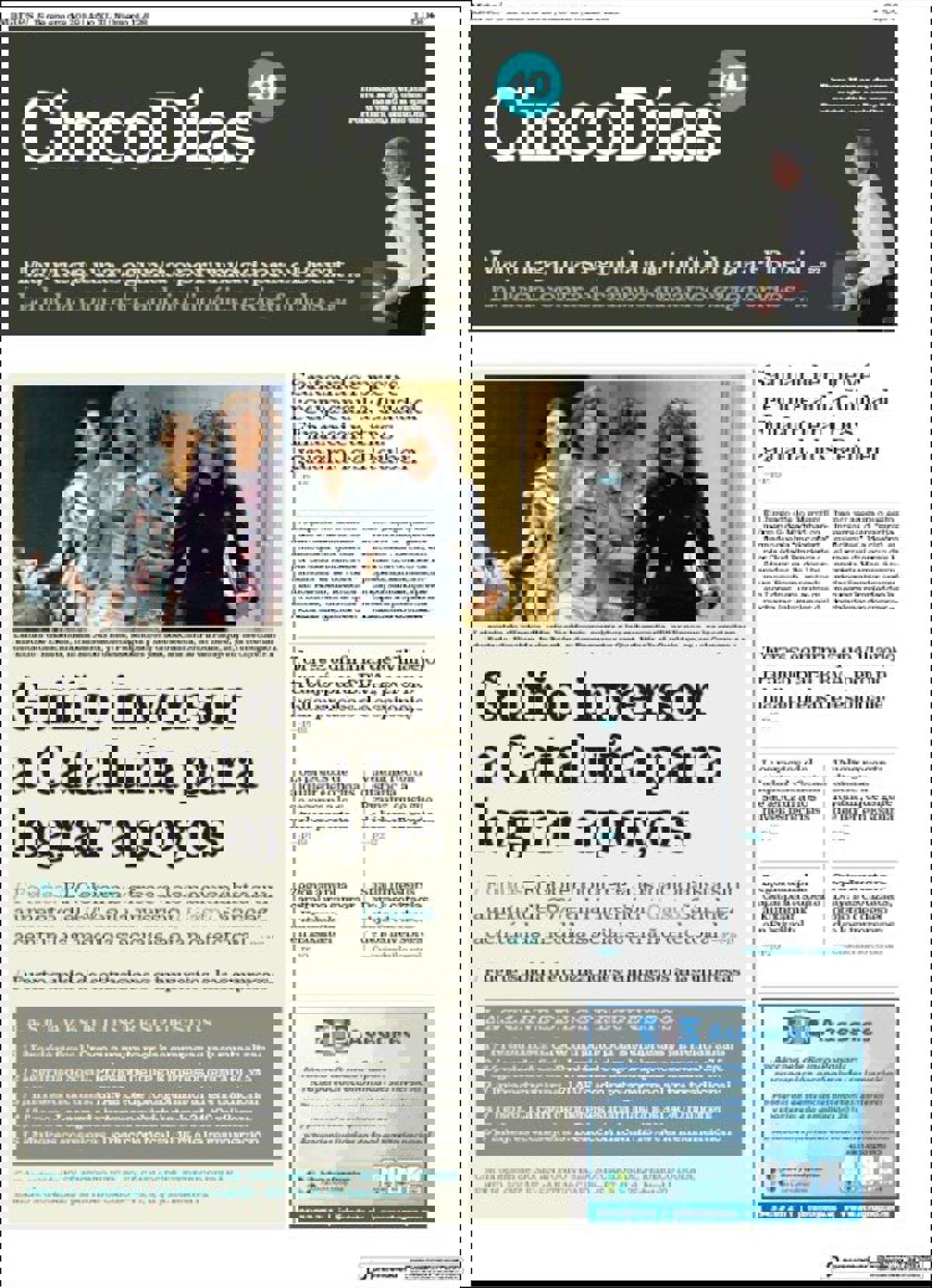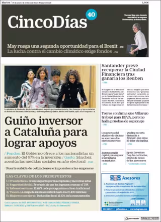 CINCO DÍAS: "Guiño inversor a Cataluña para lograr apoyos"; "Santander prevé recuperar la Ciudad Financiera tras ganarla los Reuben"; "Torres confirma que Villarejo trabajó para BBVA, pero no halla pruebas de espionaje".