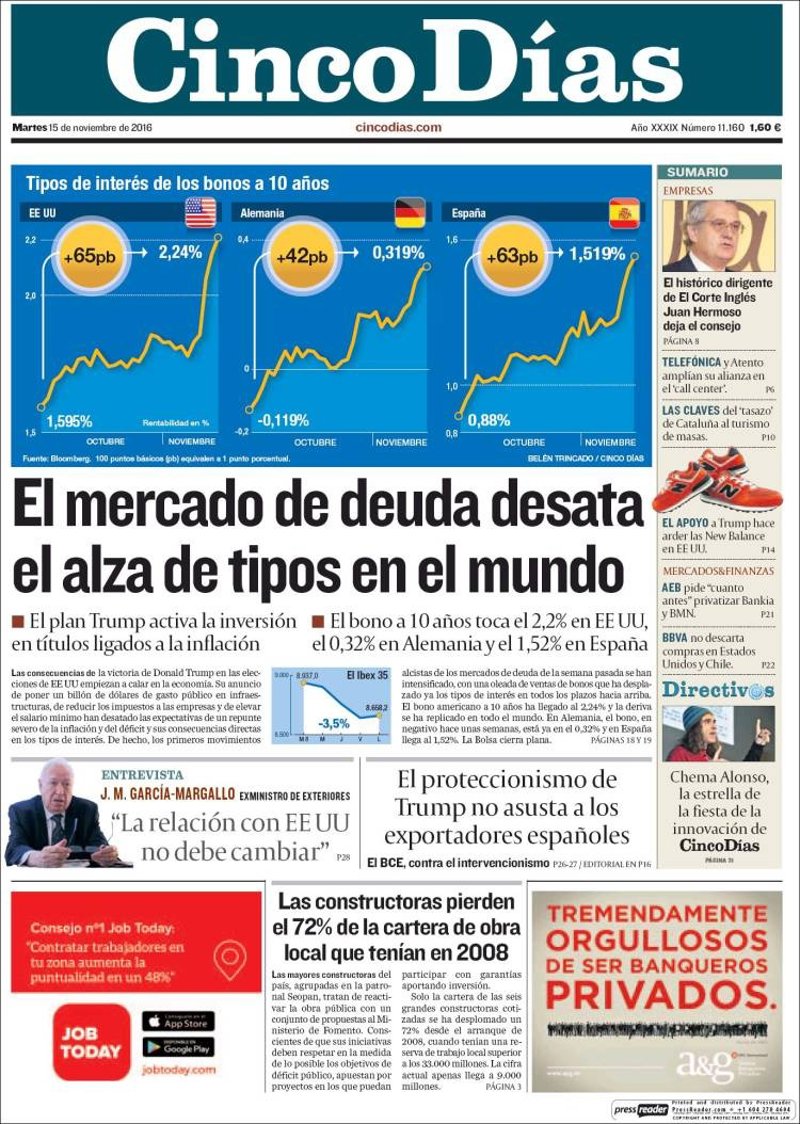 CINCO DÍAS: "El mercado de deuda desata el alza de tipos en el mundo"; "Entrevista J.M. García-Margallo: La relación con EEUU no debe cambiar"; "El proteccionismo de Trump no asusta a los exportadores españoles"; "Las constructoras pierden el 72% de la cartera de obra local que tenían en 2008".