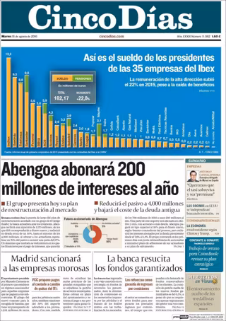 CINCO DÍAS: "Así es el sueldo de los presidentes de las 35 empresas del Ibex"; "Abengoa abonará 200 millones de intereses al año"; "Madrid sancionará a las empresas morosas"; "La banca resucita los fondos garantizados".