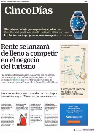 CINCO DÍAS: "Renfe se lanzará de lleno a competir en el negocio del turismo"; "Las autonomías prevén recaudar un 11% más por transmisiones y un 7% menos por sucesiones"; "La fusión de las redes de Bankia y BMN se producirá el 19 de marzo".