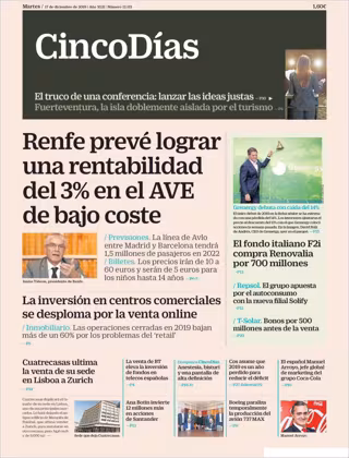 CINCO DÍAS: "Renfe prevé lograr una rentabilidad del 3% en el AVE de bajo coste"; "El fondo italiano F2i compra Renovalia por 700 millones"; "La inversión en centros comerciales se desploma por la venta online".