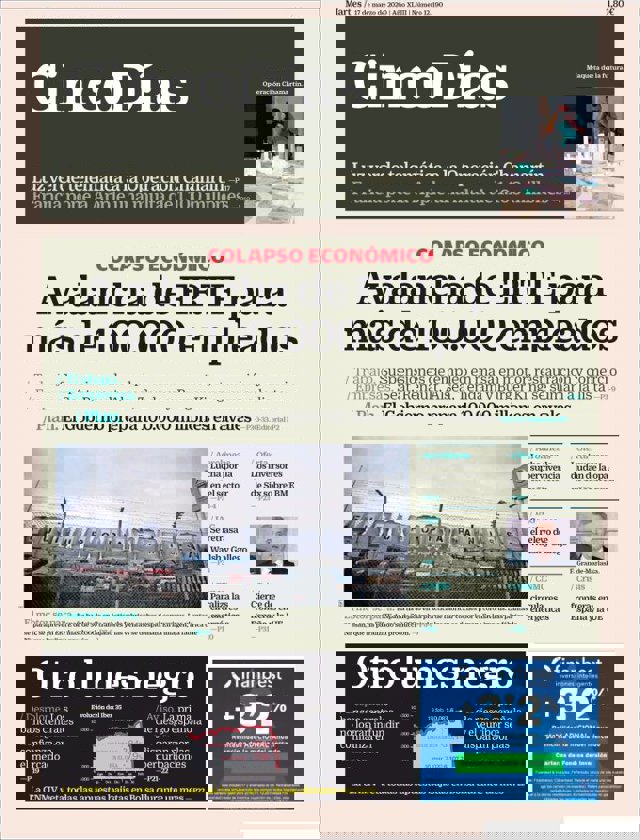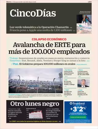 CINCO DÍAS: "Avanlancha de ERTE para más de 100.000 trabajadores"; "El Gobierno prepara más de 100.000 millones en avales"; "Otro lunes negro".