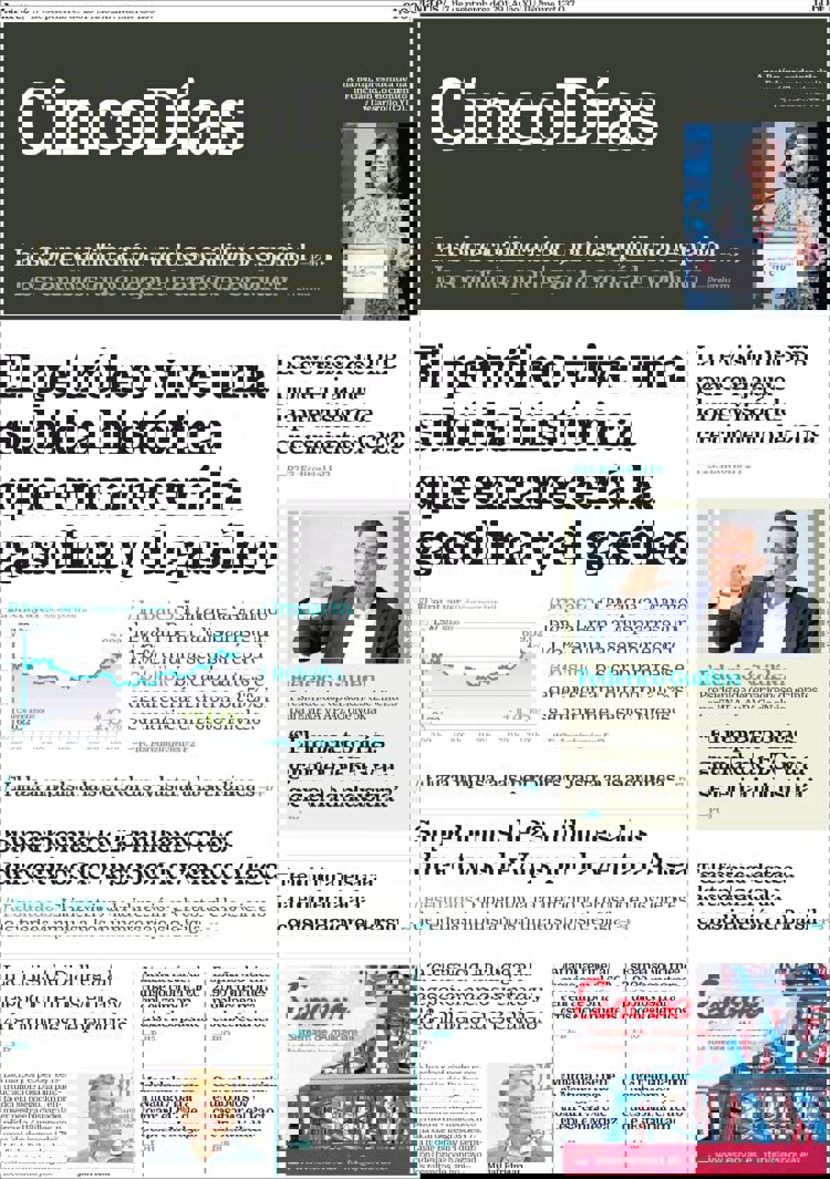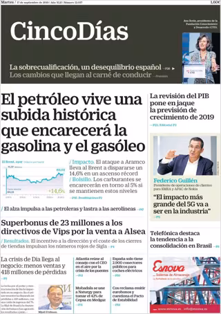 CINCO DÍAS: "El petróleo vive una subida histórica que encarecerá la gasolina y el gasóleo"; "Superbonus de 23 millones a los directivos de Vips por la venta de Alsea"; "La revisión del PIB pone en jaque la previsión de crecimiento de 2019".