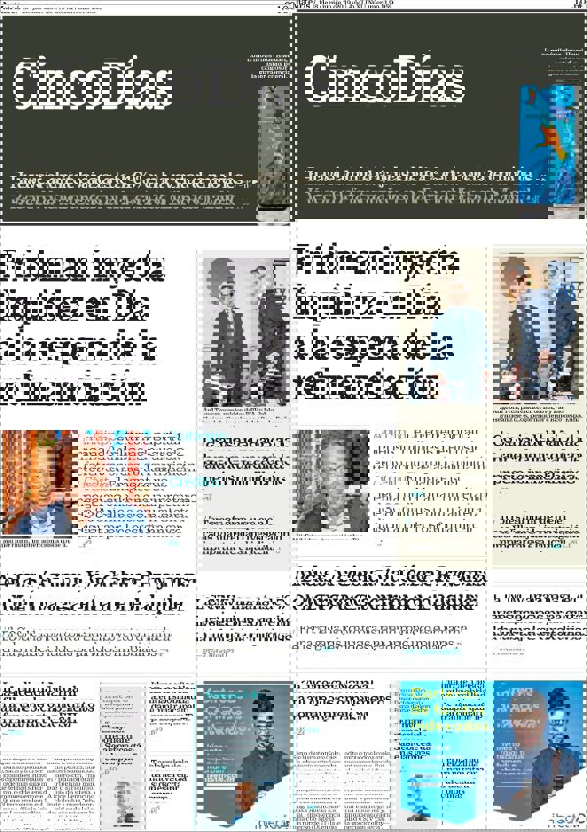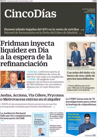 CINCO DÍAS: "Fridman inyecta liquidez en Dia a la espera de la refinanciación"; "Cos avisa del daño a la banca de una caída de precios inmobiliarios"; "Aedas, Acciona, Vía Célere, Pryconsa o Metrovacesa entran en el alquiler"; "La CNMV lanza más de 70 investigaciones para evitar la burbuja de criptomonedas".