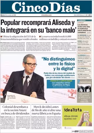 CINCO DÍAS: "Popular recompensará a Aliseda y la integrará en su 'banco malo'"; Pablo Isla da las claves del modelo de Inditex: "No distinguimos entre lo físico y lo digital"; "Las compañías enfrían el optimismo de Rajoy"; "Colonial desembarca en la socimi Axiare en busca de dividendos"; "Merck decidirá antes de fin de año si abre una nueva fábrica en España".