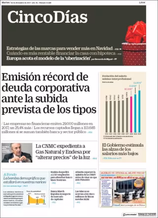 CINCO DÍAS: "Emisión récord de deuda corporativa ante la subida prevista de tipos"; "La CNMC expedienta a Gas Natural y Endesa por 'alterar precios' de la luz"; "El Gobierno estimula las alzas de los salarios más bajos".