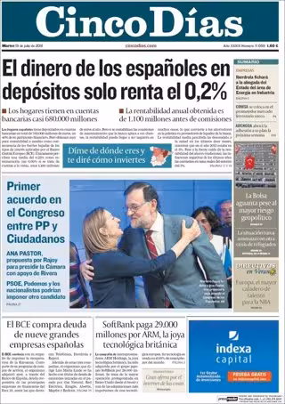 CINCO DÍAS: "El dinero de los españoles en depósitos solo renta el 0,2%"; "Primer acuerdo en el Congreso entre PP y Ciudadanos"; "El BCE compra deuda de nueve grandes empresas españolas"; "SoftBank paga 29.000 millones por ARM, la joya tecnológica británica"; "Iberdrola fichará a la abogada del Estado del área de Energía en Industria".
