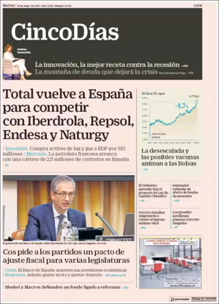 CINCO DÍAS: "Total vuelve a España para competir con Iberdrola, Repsol, Endesa y Naturgy"; "Cos pide a los partidos un pacto de ajuste fiscal para varias legislaturas"; "La desescalada y las posibles vacunas animan a las Bolsas".