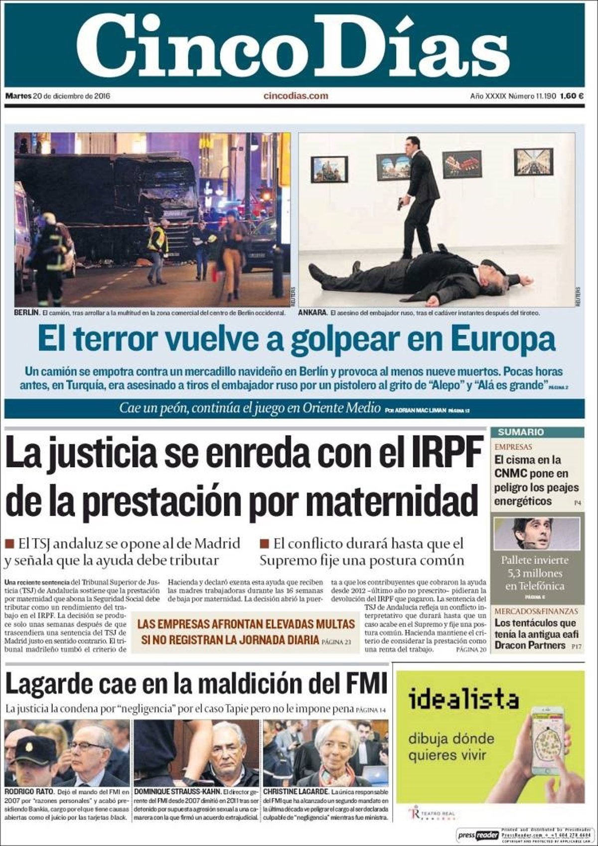 CINCO DÍAS: "El terror vuelve a golpear Europa"; "La justicia se enreda con el IRPF de la prestación por maternidad"; "Lagarde cae en la maldición del FMI"; "Las empresas afrontan elevadas multas si no registran la jornada diaria".