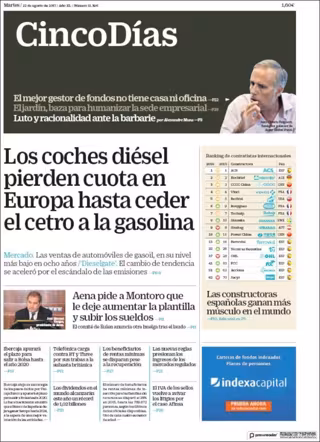 CINCO DÍAS: "Los coches diésel pierden cuota en Europa hasta ceder el cetro a la gasolina"; "Aena pide a Montoro que le deje aumentar la plantilla y subir los sueldos"; "Las constructoras españolas ganan más músculo en el mundo".