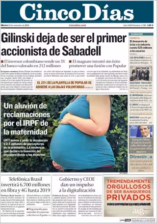 CINCO DÍAS: "Gilinski deja de ser el primer accionista de Sabadell"; "Un aluvión de reclamaciones por el IRPF de maternidad"; "Telefónica Brasil invertirá 6.700 millones en fibra y 4G hasta 2019"; "Gobierno y CEOE dan un impulso a la digitalización"; "El descuento de luz a la industria cuesta 525 millones a los usuarios".