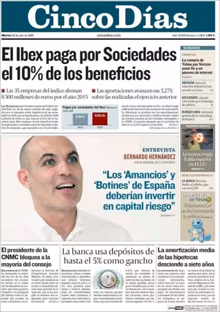 CINCO DÍAS: "El Ibex paga por Sociedades el 10% de los beneficios"; "Los 'Amancios' y los 'Botines' de España deberían invertir en capital riesgo"; "El presidente de la CNMC bloquea a la mayoría del consejo"; "La banca usa depósitos de hasta el 5% como gancho"; "La compra de Yahoo por Verizon pone fin a un pionero de internet".