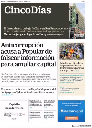 CINCO DÍAS: "Anticorrupción acusa a Popular de falsear información para ampliar capital"; "Guindos y el Círculo de Empresarios alertan de inversiones paradas por el 'procés'"; "El acceso a un fármaco en España "depende del código postal", denuncian las multinacionales".