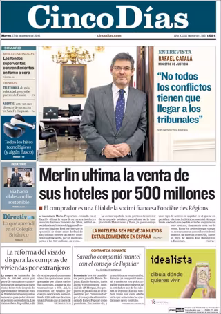 CINCO DÍAS: Rafael Catalá:"No todos los conflictos tienen que llegar a los tribunales"; "Merlín ultima la venta de sus hoteles por 500 millones"; "La hotelera SEH prevé 30 nuevos establecimientos en España"; "La reforma del visado dispara la compras de viviendas por extranjeros"; "Saracho compartió mantel con el consejo de Popular".