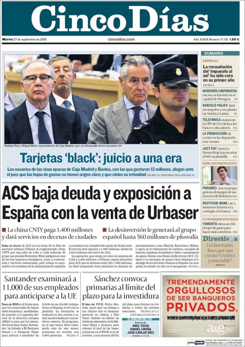 CINCO DÍAS: "Tarjetas 'black': juicio a una era"; "ACS baja deuda y exposición a España con la venta de Urbaser"; "Santander examinará a 11.000 de sus empleados para anticiparse a la UE"; "Sánchez convoca primarias al límite del plazo para la investidura"; "La recaudación del 'impuesto al sol' ha sido cero en su primer año".