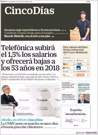 CINCO DÍAS: "Telefónica subirá el 1,5% los salarios y ofrecerá bajas a los 53 años en 2018"; "La CNMV pone en marcha en unos días el buzón para dar chivatazos"; "Diez valores del Euro Stoxx rentan más del 5% por dividendo".