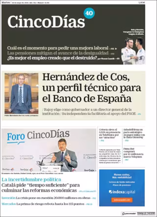 CINCO DÍAS: "Hernández de Cos, un perfil técnico para el Banco de España"; "Catalá pide "tiempo suficiente" para culminar las reformas económicas"; "Criteria eleva al 0,52% su presencia en Telefónica por ser 'atractiva'".