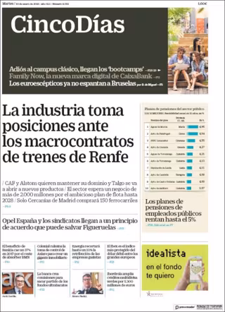 CINCO DÍAS: "La industria toma posiciones ante los macrocontratos de trenes de Renfe"; "Los planes de pensiones de empleados públicos rentan hasta el 5% más"; "Opel España y los sindicatos llegan a un principio de acuerdo que puede salvar Figueruelas".