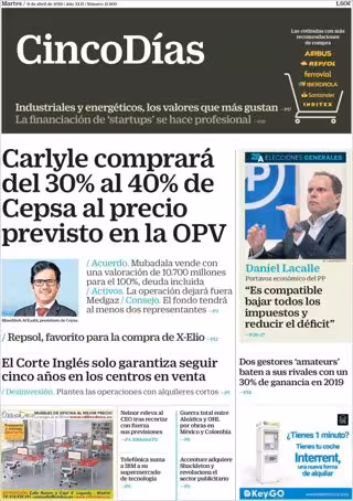 CINCO DÍAS: "Carlyle comprará del 30% al 40% de Cepsa al precio previsto en la OPV"; "Repsol, favorito para la compra de X-Elio"; "El Corte Inglés solo garantiza seguir cinco años en los centros en venta".