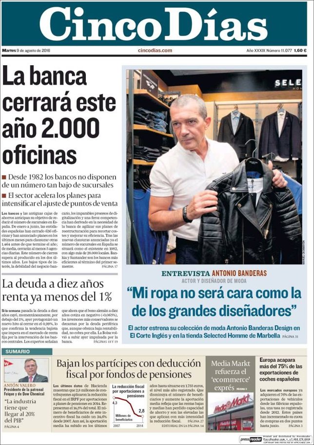 CINCO DÍAS: "La banca cerrará este año 2.000 oficinas"; "La deuda a diez años renta ya menos del 1%"; "'Mi ropa será cara como la de los grandes diseñadores', sostiene Antonio Banderas en una entrevista"; "Bajan los partícipes con deducción fiscal por fondos de pensiones"; "Europa acapara más del 75% de las exportaciones de coches españoles".