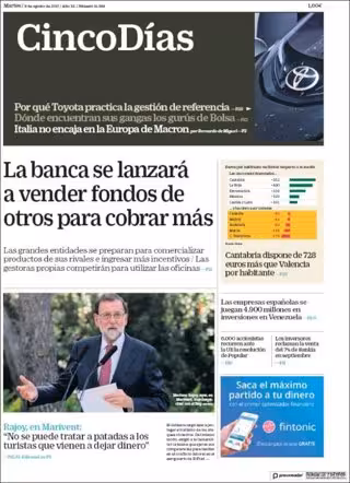 CINCO DÍAS: "La banca se lanzará a vender fondos de otros para cobrar más"; Rajoy en Miravent: "No se puede tratar a patadas a los turistas que vienen a dejar dinero"; "Cantabria dispone de 728 euros más que Valencia por habitante".