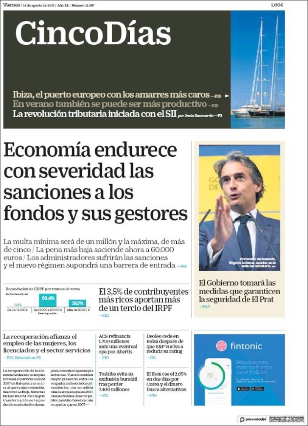 CINCO DÍAS: "Economía endurece con severidad las sanciones a los fondos y sus gestores"; "El Gobierno tomará las medidas que garanticen la seguridad de El Prat"; "El 3,5% de los contribuyentes más ricos aportan más de un tercio del IRPF".