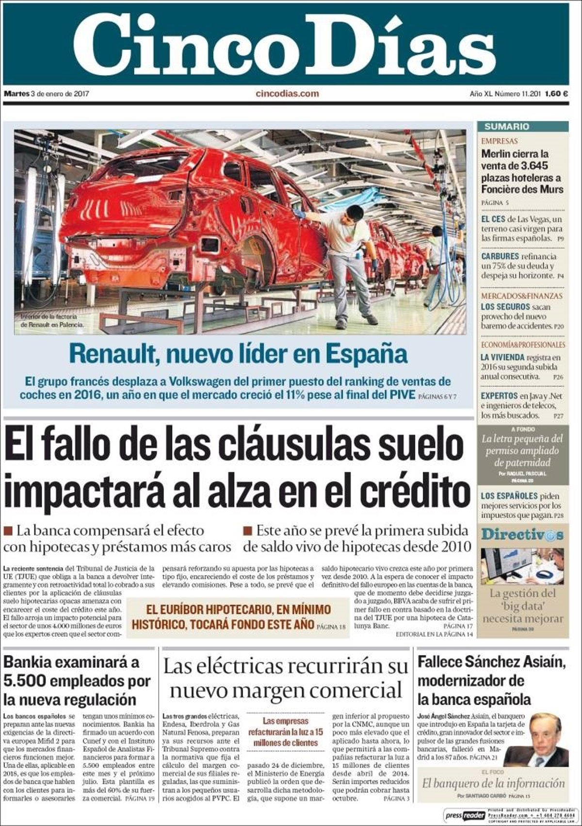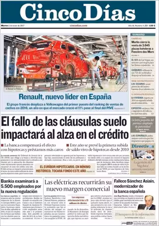 CINCO DÍAS: "Renault,nuevo líder en España"; "El fallo de cláusulas suelo impactará al alza en el crédito"; "El euríbor hipotecario, en mínimo histórico, tocará fondo este año"; "Bankia examinará a 5.500 empleados por la nueva regulación"; "Las eléctricas recurrirán su nuevo margen comercial"; "Fallece Sánchez Asiaín, modernizador de la banca española".