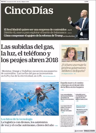 CINCO DÍAS: "Las subidas del gas, la luz, el teléfono y los peajes abren 2018 "; "La logística con drones, los asistentes de voy el coche autónomo, claves del año"; "España marca el camino a Europa en el desarrollo de la fibra en los hogares".