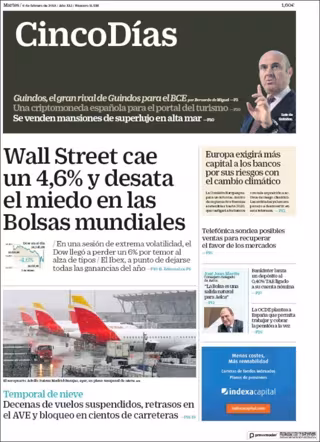 CINCO DÍAS: "Wall Street cae un 4,6% y desata el miedo en las Bolsas mundiales"; "Europa exigirá más capital a los bancos por sus riesgos con el cambio climático"; "Temporal de nieve: decenas de vuelos suspendidos, retrasos en el AVE y bloqueo e cientos de carreteras".