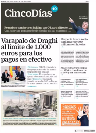 CINCO DÍAS: "Varapalo de Draghi al límite de 1.000 euros para los pagos en efectivo"; "Hesperia busca socio para invertir 600 millones en hoteles"; "ACS reestructura su filial en México tras descartar la OPV y ser sancionada".
