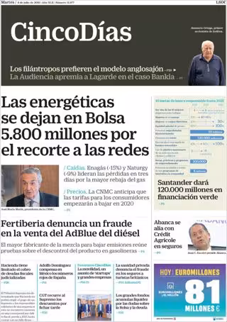 CINCO DÍAS: "Las energéticas se dejan en Bolsa 5.800 millones por el recorte a las redes"; "Fertiberia denuncia un fraude en la venta del Adblue del diésel"; "Santander dará 120.000 millones en financiación verde".