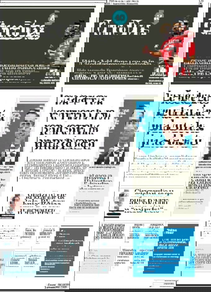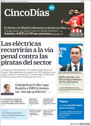 CINCO DÍAS: "Las eléctricas recurrirán a la vía penal contra las piratas del sector"; "Goirigolzarri dice que Bankia y BBVA tienen un 'encaje perfecto'"; "Italia expone a la UE al bipartidismo de los extremos".