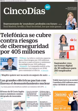 CINCO DÍAS: "Telefónica se cubre contra riesgos de ciberseguridad por 405 millones"; "Santander crea un bonus digital de 30 millones para 250 empleados"; "Las grandes eléctricas pactan con Enresa el desmantelamiento nuclear".