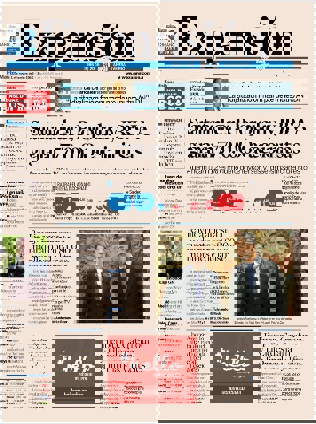 EXPANSIÓN: "Santander, Popular y BBVA ganan 770.000 accionistas"; "Rajoy arranca su mandato con 8.000 millones de lastre"; "Abengoa: la falta de núcleo duro da poder al consejo"; "Hipercor, Carrefour y Lidl desafían a Primark y Lefties"; Entrevista al director general de Vincci Hoteles, Carlos Calero: "La digitalización forma parte de nuestro ADN".