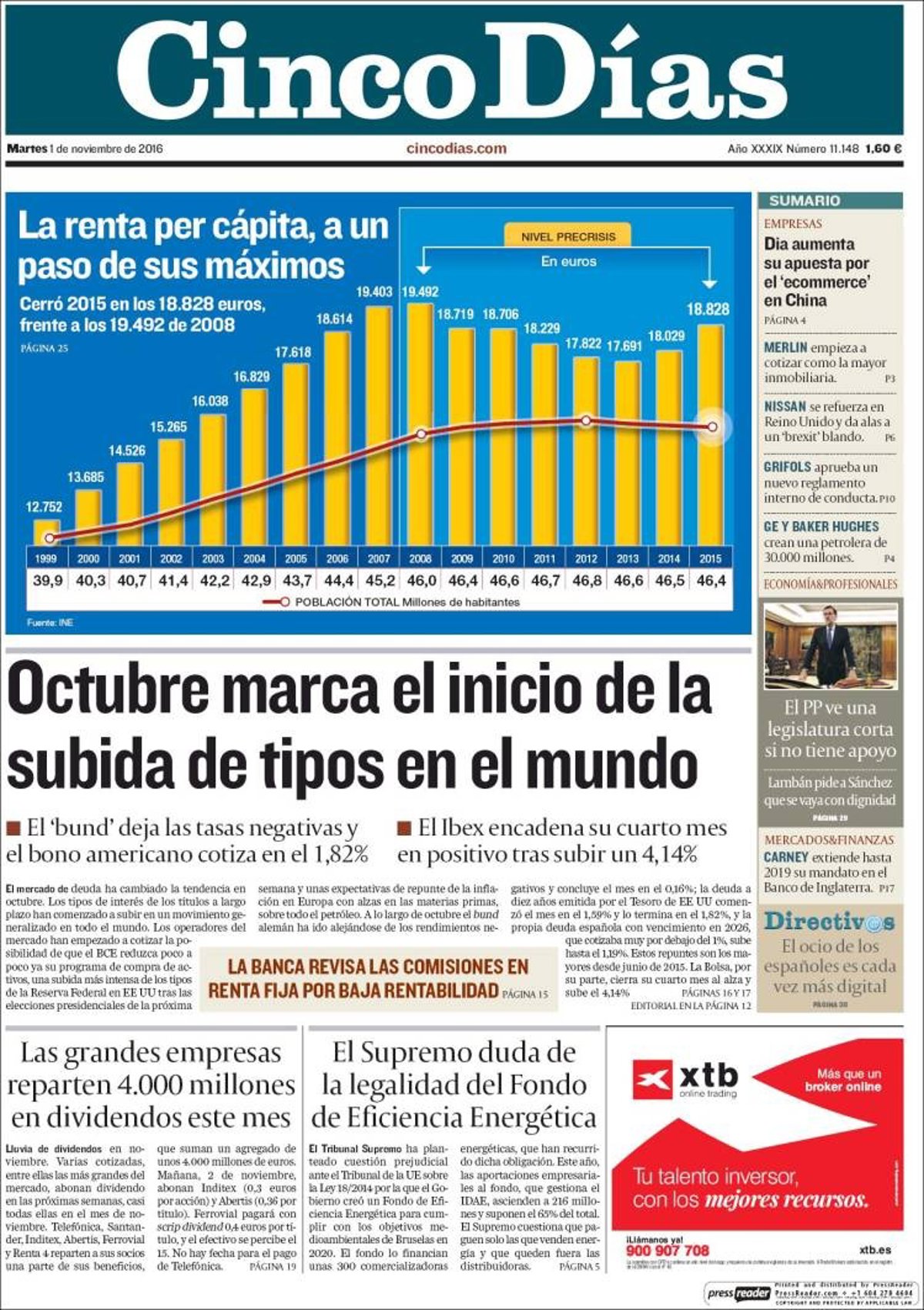 CINCO DÍAS: "La renta per cápita, a un paso de sus máximos"; "Octubre marca el inicio de la subida de tipos en el mundo"; "Las grandes empresas reparten 4.000 millones en dividendos este mes"; "El supremo duda de la legalidad del Fondo de Eficiencia Energética"; "La banca revisa las comisiones en renta fija por baja rentabilidad".