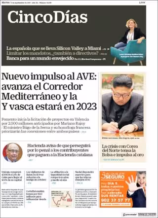 CINCO DÍAS: "Nuevo impulso al AVE: avanza el Corredor Mediterráneo y la Y vasca estará en 2023"; "Hacienda avisa de que perseguirá por lo penal a los contribuyentes que paguen a la Hacienda catalana"; "La crisis con Corea del Norte tensa la Bolsa e impulsa al oro".