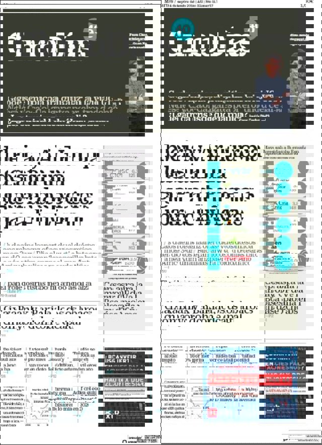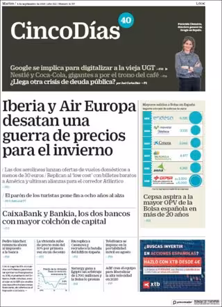 CINCO DÍAS: "Iberia y Air Europa desatan una guerra de precios para el invierno"; "CaixaBank y Bankia, los dos bancos con mayor colchón de capital"; "Cepsa aspira a la mayor OPV de la Bolsa española en más de 20 años".