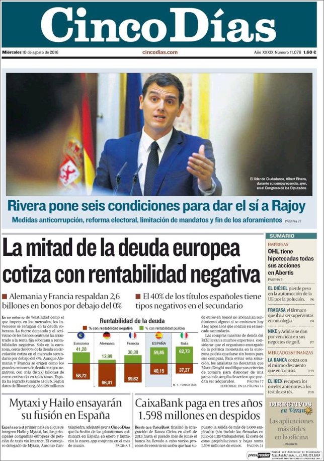 CINCO DÍAS: "Rivera pone seis condiciones para dar el sí a Rajoy"; "La mitad de la deuda europea cotiza en rentabilidad negativa"; "Mytaxi y Hailo ensayarán su fusión en España"; "CaixaBank paga en tres años 1.598 millones en despidos.