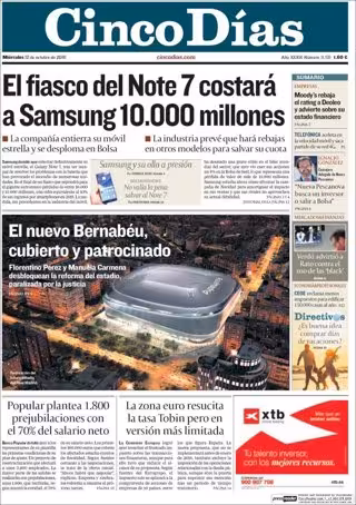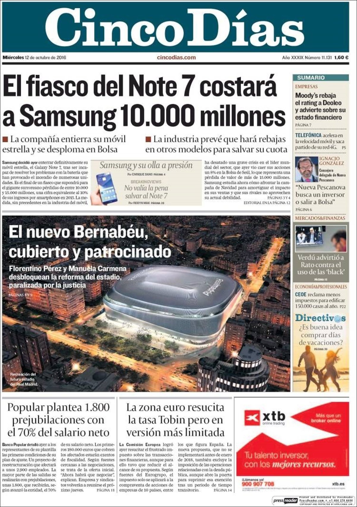 CINCO DÍAS: "El fiasco del Note 7 costará a Samsung 10.000 millones"; "El nuevo Bernabéu, cubierto y patrocinado"; "Popular plantea 1.800 prejubilaciones con el 70% del salario neto"; "La zona euro resucita la tasa Tobin pero en versión más limitada"; "Moody's rebaja el rating a Deoleo y advierte sobre su estado financiero".