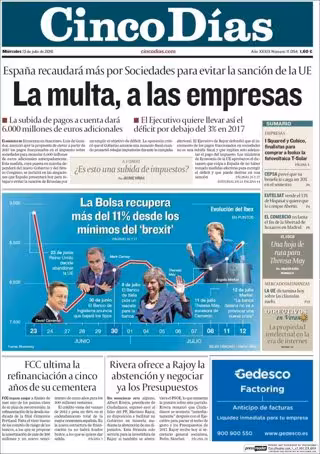 CINCO DÍAS: "La multa, a las empresas"; La bolsa recupera más del 11% desde los mínimos del Brexit"; "FCC ultima la refinanciación a cinco años de su cementera"; "Rivera ofrece a Rajoy la abstención y negociar ya los presupuestos".