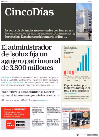 CINCO DÍAS: "El administrador de Isolux fija un agujero patrimonial de 3.800 millones"; "Vodafone y la estadounidense Liberty agitan el tablero europeo de las telecos"; "España cobra por las letras más que por el BCE por el depósito".