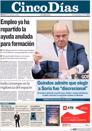 CINCO DÍAS: "Empleo ya ha repartido la ayuda anulada para formación"; "Indra irrumpe en la vigilancia del espacio"; "Guindos admite que elegir a Soria fue 'discrecional'"; "GIP incluye en el precio de Gas Natural el próximo dividendo".