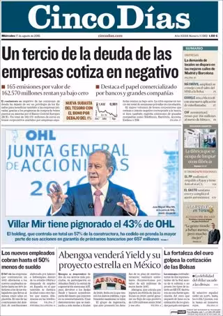 CINCO DÍAS: "Un tercio de la deuda de las empresas cotiza en negativo"; "Villar Mir tiene pignorado el 43% de OHL"; "Los nuevos empleados cobran hasta el 50% menos de sueldo"; "Abengoa venderá Yield y su proyecto estrella en México"; "La fortaleza del euro golpea la cotización de las Bolsas".