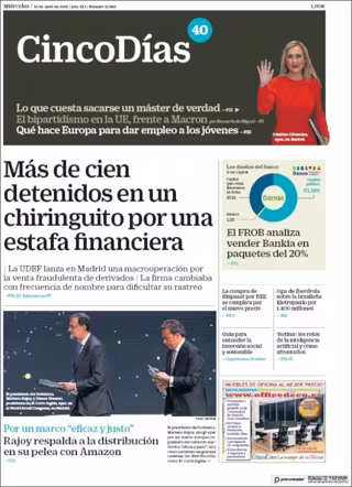 CINCO DÍAS: "Más de cien detenidos en un chiringuito por una estafa financiera"; "El FROB analiza vender Bankia en paquetes del 20%"; "Rajoy respalda a la distribución en su pelea con Amazon".