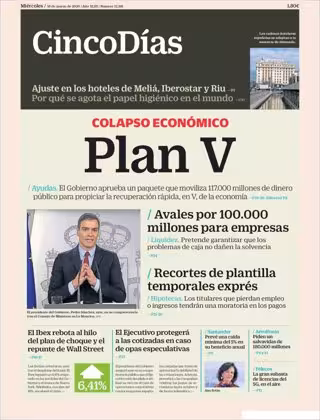 CINCO DÍAS: "Avales por 100.000 millones para empresas"; "Recortes de plantilla temporales exprés"; "El Ibex rebota al hilo del plan de choque y el repunte de Wall Street".