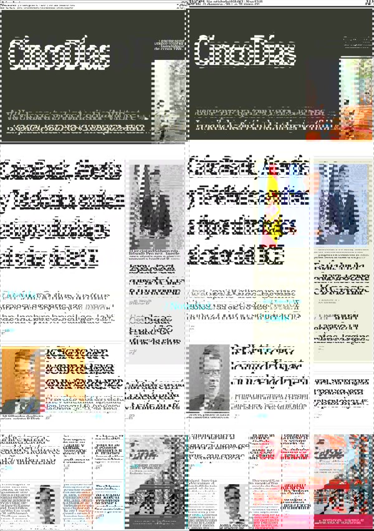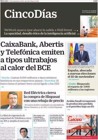 CINCO DÍAS: "CaixaBank, Abertis y Telefónica emiten a tipos ultrabajos al calor del BCE"; "Red Eléctrica cierra la compra de Hispasat con una rebaja de precio"; "España, abocada a nuevas elecciones el 10 de noviembre".