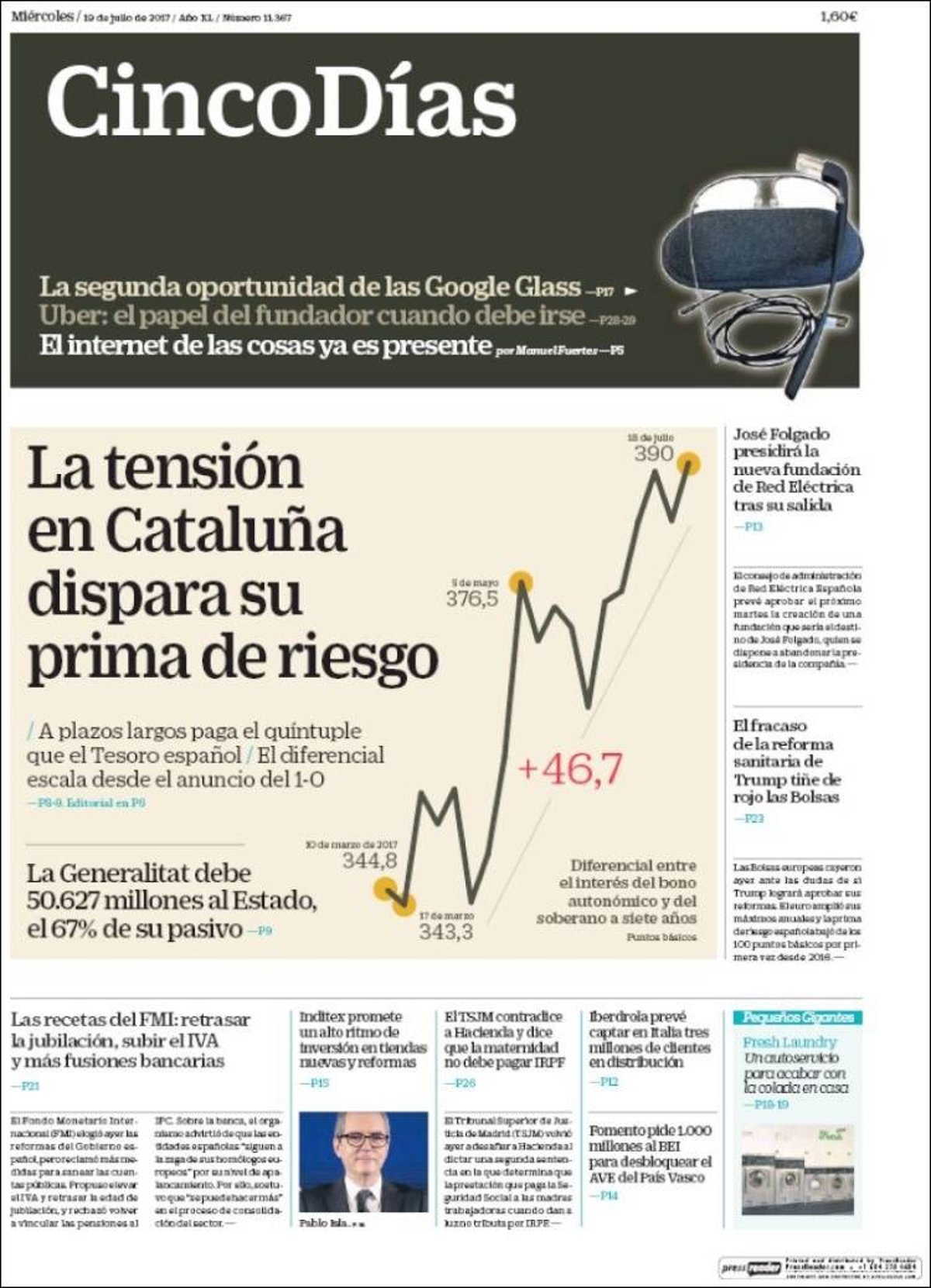 CINCO DÍAS: "La tensión en Cataluña dispara su prima de riesgo"; "La Generalitat debe 50.627 millones al Estado, el 67% de su pasivo"; "José Folgado presidirá la nueva fundación de Red Eléctrica tras su salida"; "Las recetas del FMI: retrasar la jubilación, subir el IVA y más fusiones bancarias".