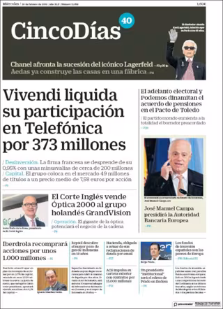 CINCO DÍAS: "Vivendi liquida su participación en Telefónica"; "El Corte Inglés vende Óptica 2000 al grupo holandés GrandVision"; "El adelanto electoral y Podemos dinamitan el acuerdo de pensiones en el Pacto de Toledo".